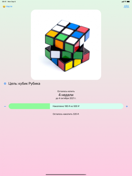 Выбрав в списке имя конкретного ребенка, пользователи увидят его цель и текущий прогресс. Приложение "Я коплю" автоматически вычисляет оставшееся время для достижения цели, а каждую неделю исправно прибавляет фиксированное количества выдаваемых денег.