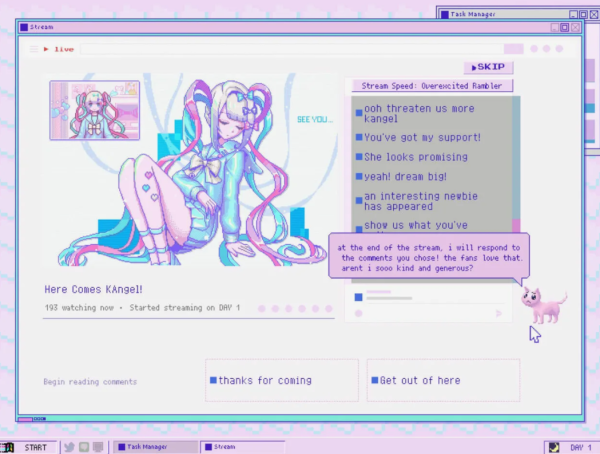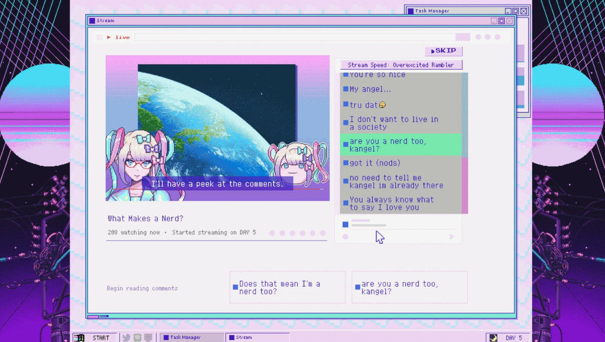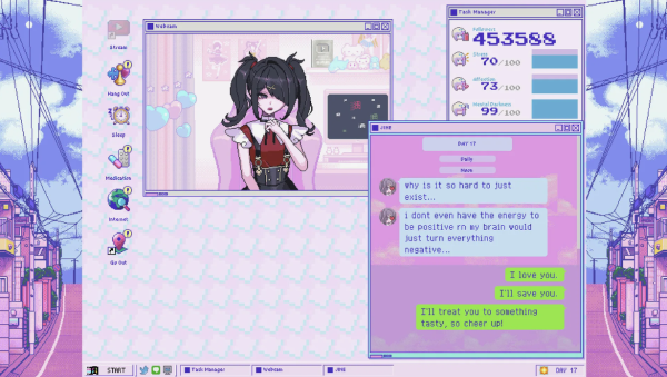 Needy Streamer Overload – аниме новелла про душевные терзания главной героини. Вам предстоит помочь молодой девушке преодолеть все комплексы и избавиться от ментальных расстройств. В этом деле ей поможет сближение со своей аудиторией через прямые трансляции. Героиня ведет собственный блог и общается с подписчиками на стримах. Большая часть геймплея подается через управление рабочим столом, на котором вам доступны программы, игры, чат, настройки и многое другое.В игре Needy Streamer Overload вы сможете влиять буквально на каждое действие и решение героини. Необходимо следить за настроением и поведением стримерши и отталкиваться от показателей. Вашей задачей является выбор правильных ответов и действий, чтобы позитивное настроение росло и открывало новые варианты в диалогах и решениях. Также вы можете последовать и по альтернативному пути, чтобы выйти на худший вариант развития событий. Между двумя крайностями имеется несколько других линий, поэтому рекомендуем пройти Needy Streamer Overload несколько раз, чтобы по достоинству оценить историю со всех точек зрения.