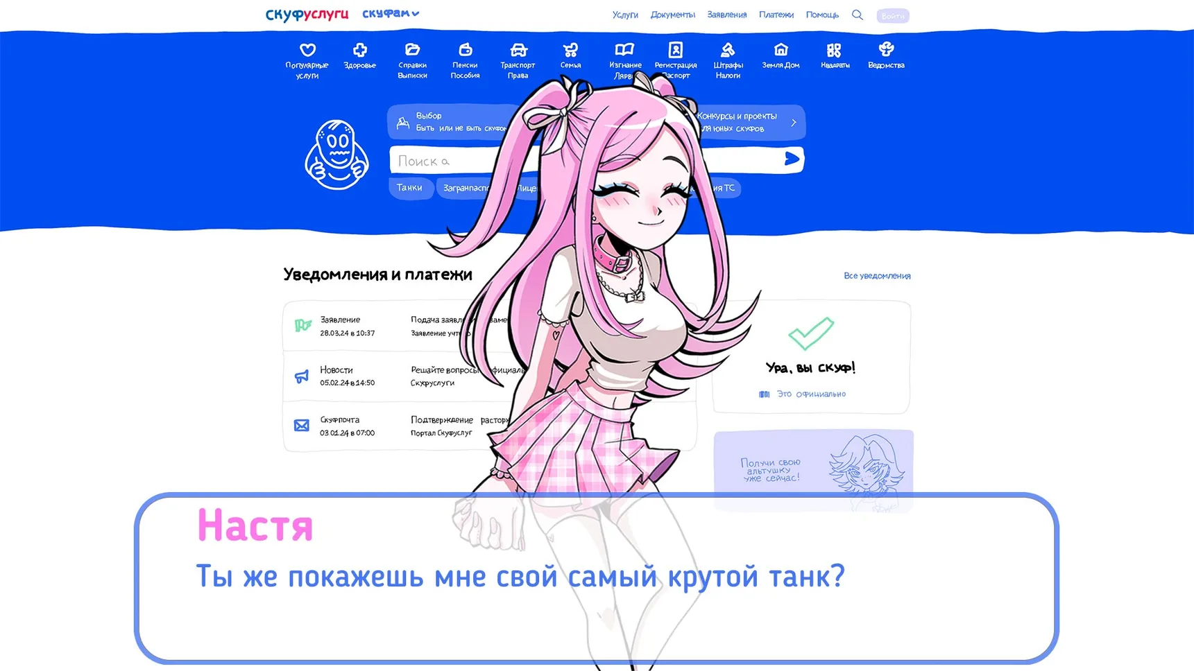 «Альтушка для Скуфа 2» – масштабное обновление для шуточной новеллы. Вам предстоит вернуться к роли лысеющего мужика с пивным пузом, чтобы вновь зайти на портал с государственными услугами и разобраться в его возможностях. Авторы предлагают познакомиться с новыми героинями, оценить озвучку диалогов и вариативность прохождения. Качайте новую версию новеллы «Альтушка для Скуфа 2» на Андроид уже сегодня!