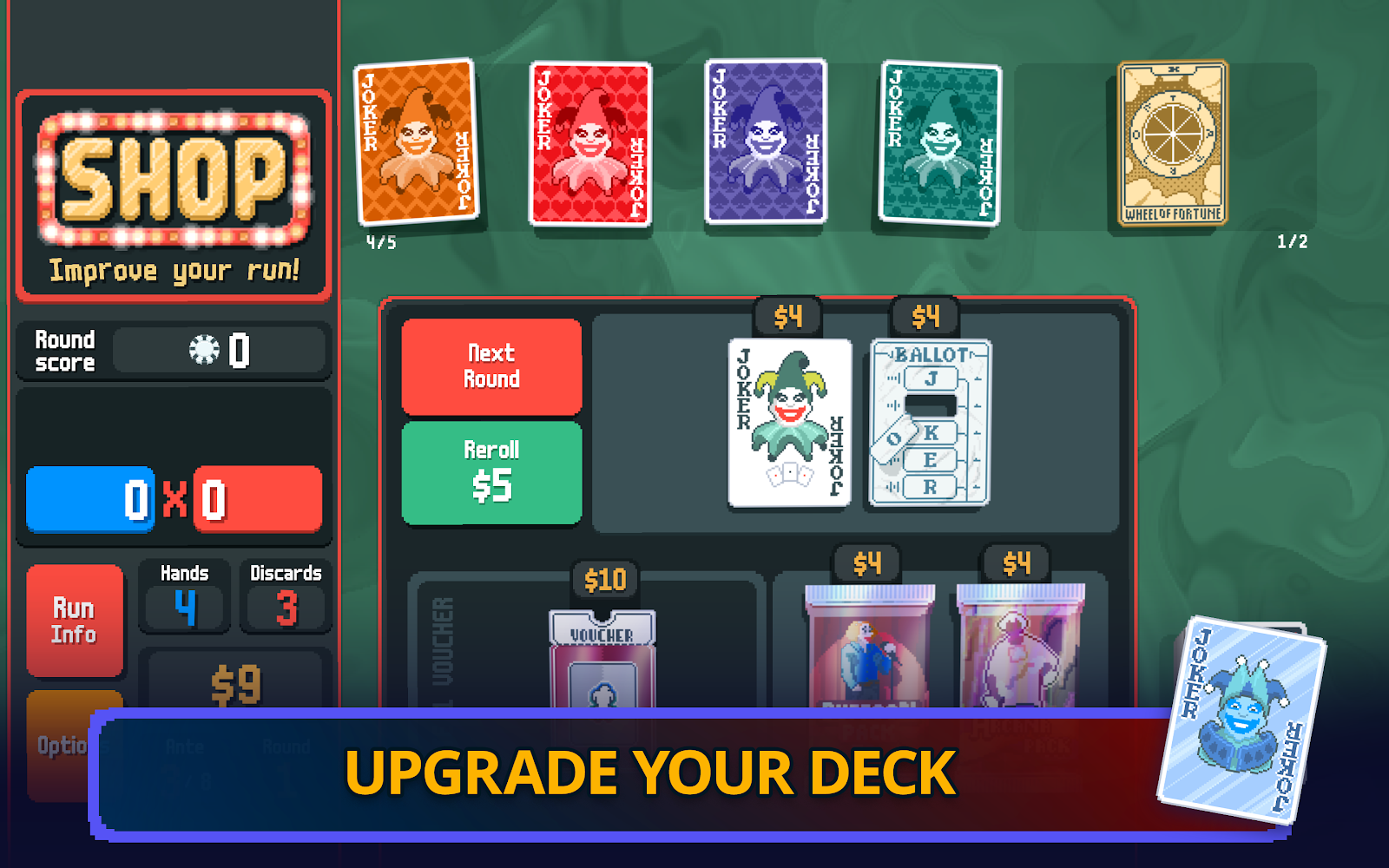 Основной задачей игрока в Balatro является прохождение нескольких блайндов с постепенно повышающимися ставками и новыми ограничениями. Собирайте комбинации карт и ловите множители, чтобы побить установленную цель по очкам. Добиться результата штатной колодой не выйдет – именно здесь в дело вступают уникальные механики игры. Собирайте специальных джокеров, влияющих на партию и руку, улучшайте стоимость и множители отдельных карт, повышайте ценность комбинаций и так далее. Между раундами можно закупиться в магазине, а затем перейти к следующему блайнду. Не стоит зацикливаться на одной стратегии и стараться подогнать под нее каждую колоду – игра подкидывает случайные комбинации и предлагает поэкспериментировать с картами.