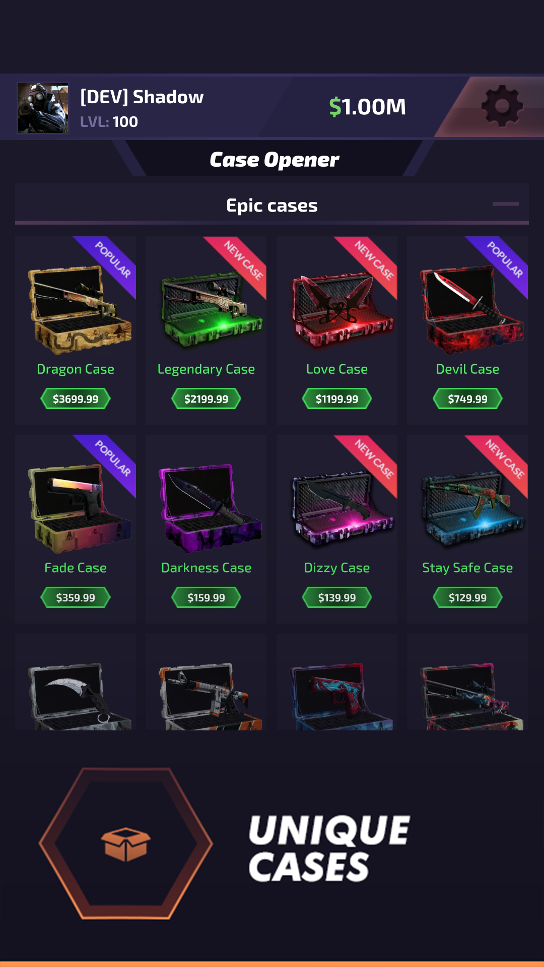 Пользуйтесь взломанной Case Battle: Skins Simulator и получайте весь контент на старте. Много денег, золота, все ящики и прочее станет доступно бесплатно и уже спустя пару минут после запуска игры. Получайте максимум удовольствия от открытия кейсов и пополняйте коллекцию редкими предметами.