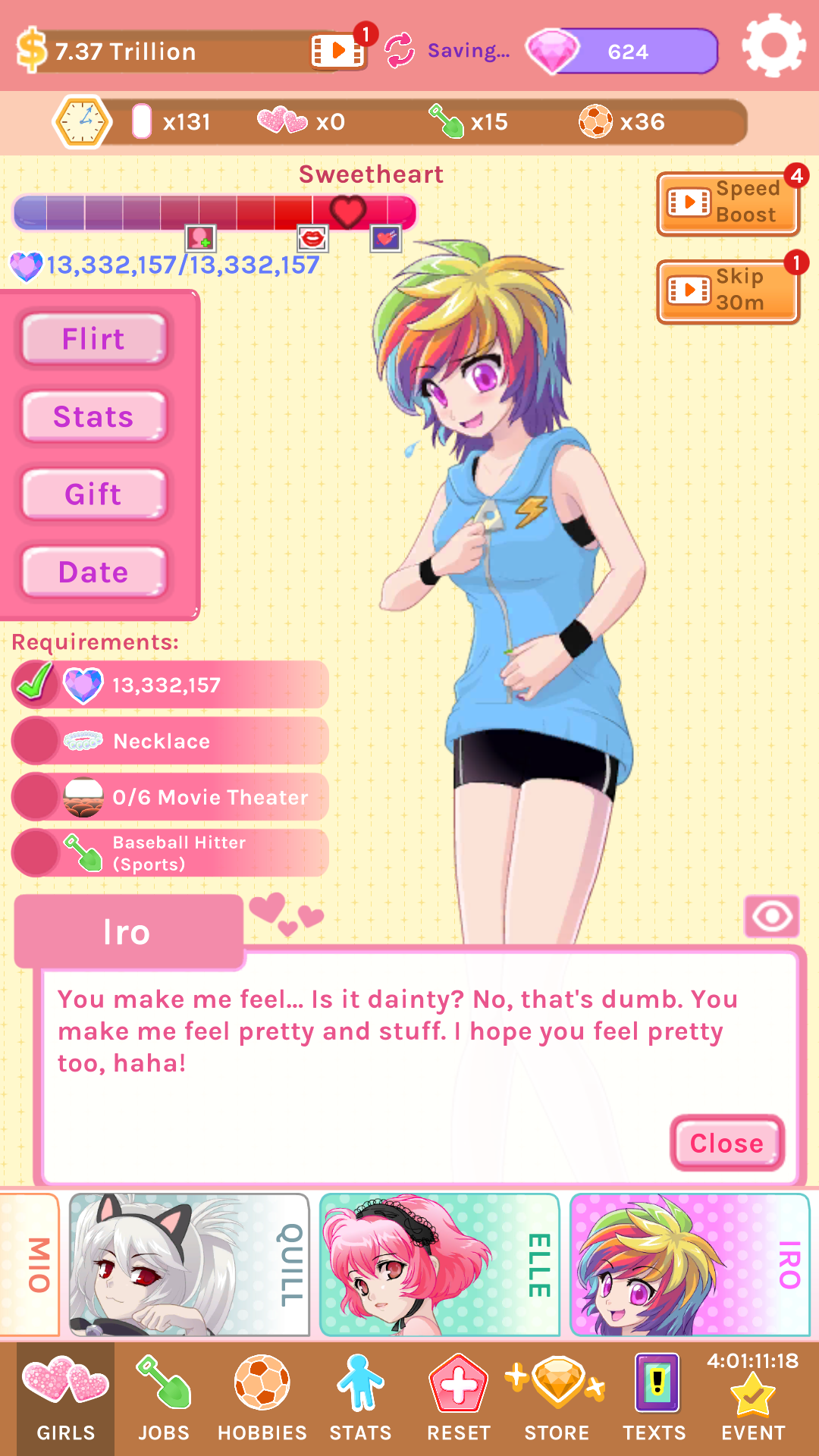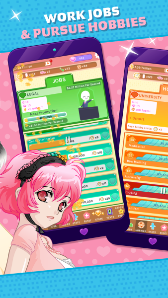 И весь этот необычный геймплей облачен в милую аниме-стилистику с яркими картинками, локациями и оформлением меню. Качайте ум и кругозор, чтобы понравиться интеллектуалкам. Набивайте кошелек на лучшей работе, чтобы развлекать тусовщиц и дарить ценные украшения. Занимайтесь спортом, чтобы удивлять девушек в постели и радовать накачанным телом. Каждый параметр в данном симуляторе влияет на будущие отношения главного героя. Формат idle-менеджера позволяет прикладывать минимум усилий в реальности, но ставить невыполнимые задачи для виртуального персонажа.
