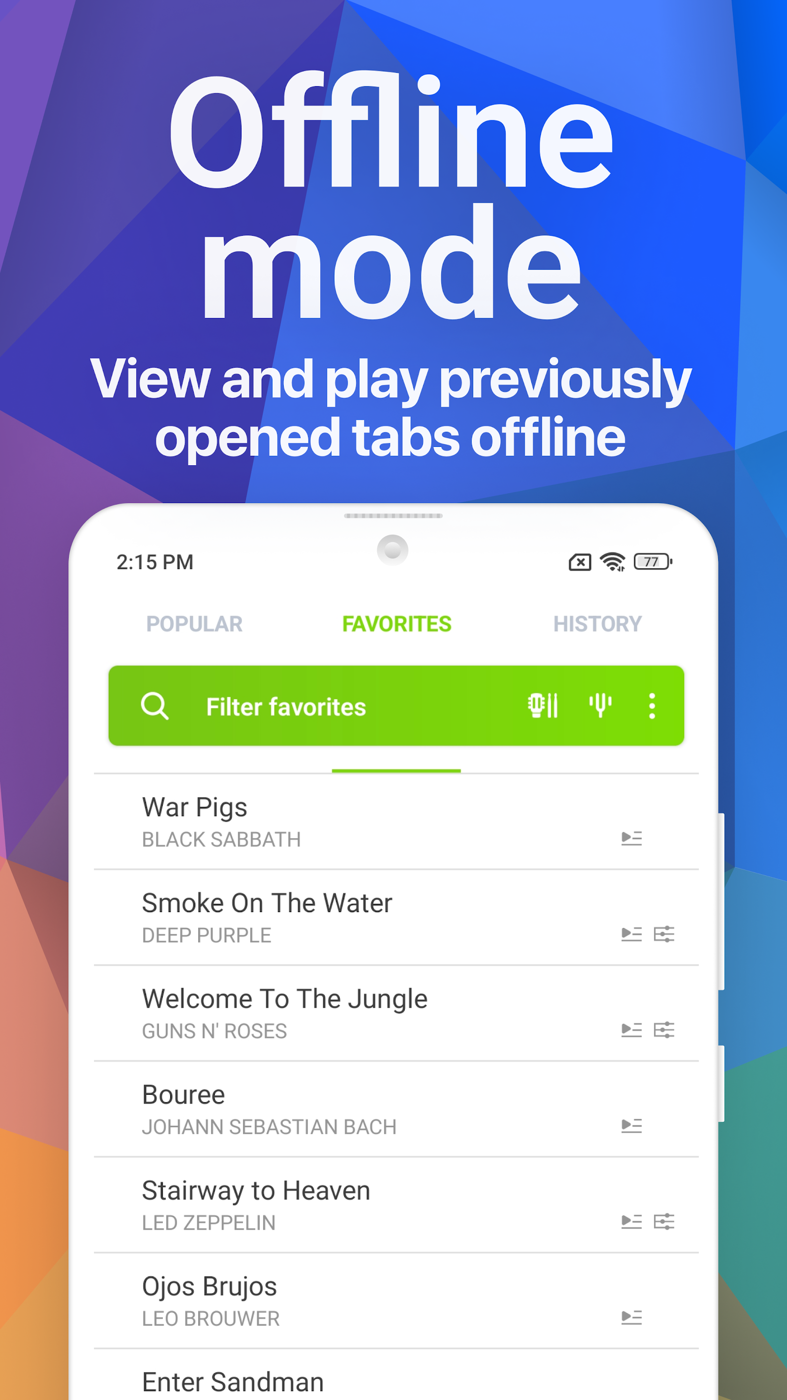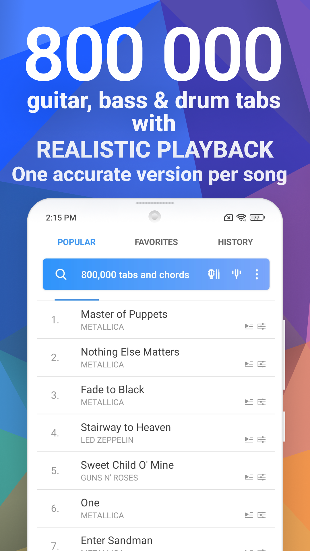 Songsterr содержит больше 800 тысяч уникальных табулатур и аккордов. Разработчики подбирают самые качественные и точные варианты для каждого трека, чтобы пользователь получал наилучший опыт взаимодействия с приложением. Все представленные данные являются полностью легальными и официальными. При необходимости вы можете переключаться между табулатурами для гитары, баса и барабанов.Возможности: